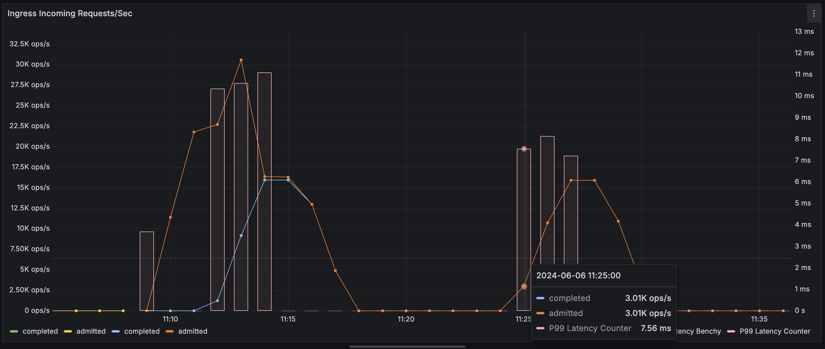 This is a non-exhaustive list of metrics that can be used to measure system performance:restate_ingress_requests_total(counter) - Number of ingress requests in different states (admitted, completed, throttled, etc.)restate_ingress_request_duration_seconds(summary) - Total latency of Ingress request processing in secondsrestate_rocksdb_estimate_live_data_size_bytes(Gauge) - Size of the live data in RocksDb databases in bytesrestate_invoker_invocation_task_total(counter) - The number of invocation tasks to user handlers